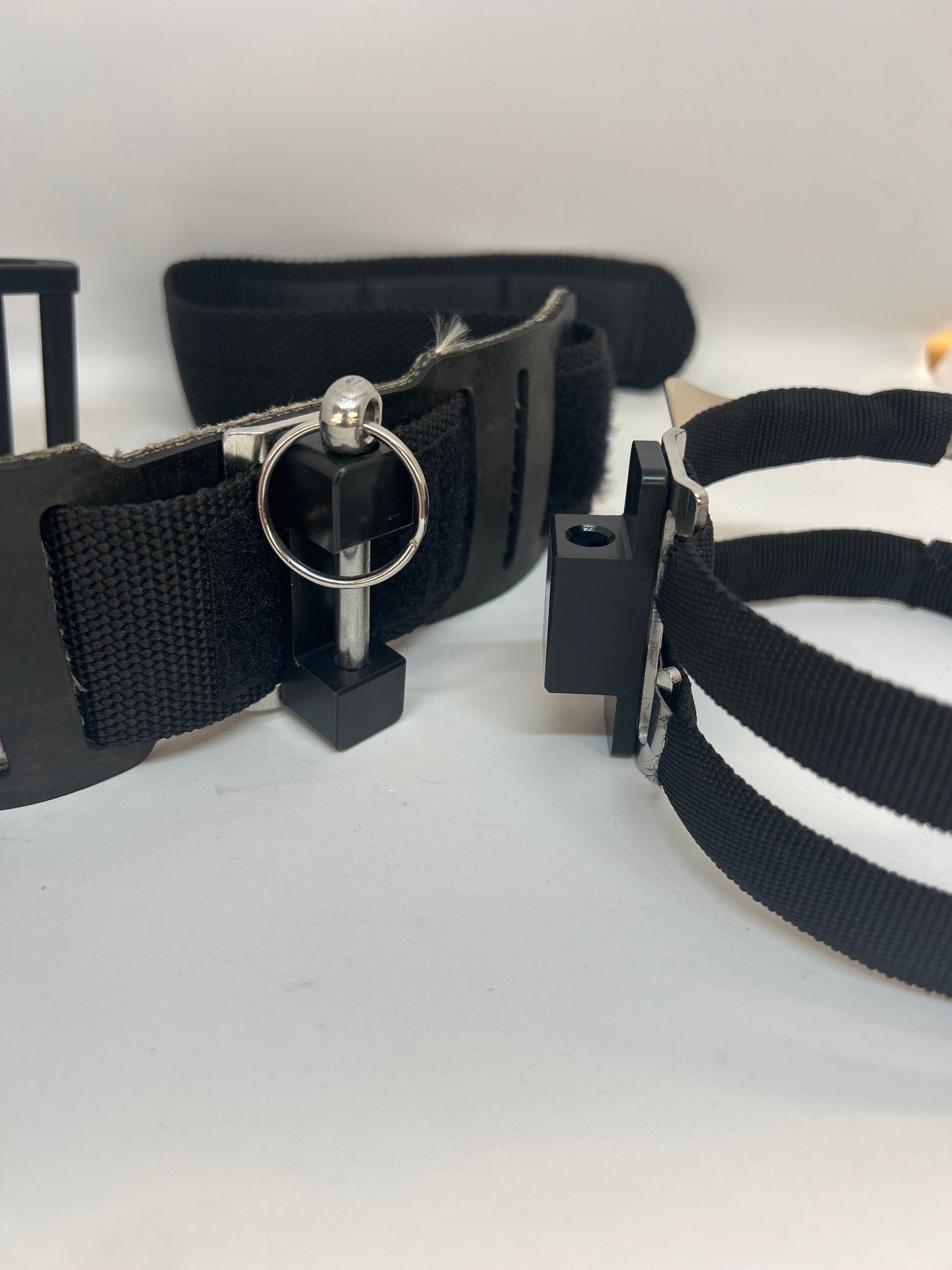 - fits to 2" webbing such as cam-bands & harnesses, or hose clamps